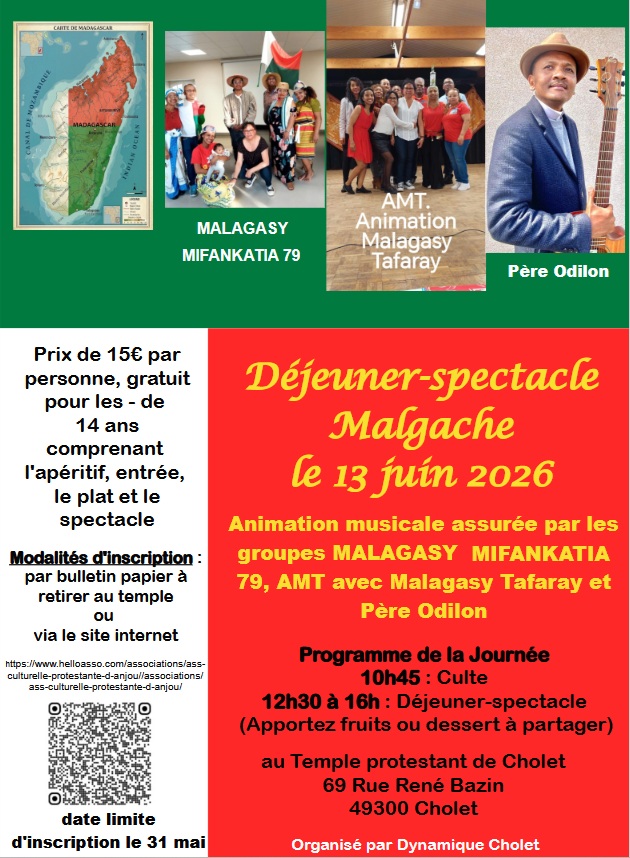 Avec déjeuner-spectacle malgache avec les groupes MALAGASY MIFANKATIA 79, animation par Malagasy Tafaray et le père Odilon.