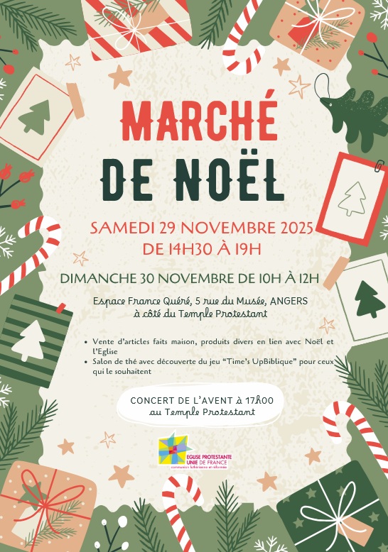 Samedi 29 novembre de 14h30 à 19h, Espace France Quéré. Concert de l’Avent à 17h au Temple - Dimanche 30 novembre, de 10h à 12h.